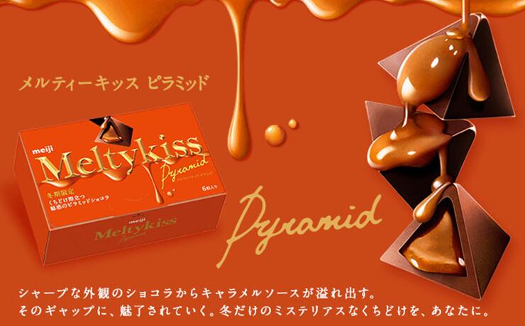 MeltyKiss(雪吻)的产品名称十分富有诗意,给人以无限遐想的空间。淡雪焦糖的新口味,更独特是在于它金字塔的外形,冬季限定热销品,一起走进唯美的雪吻世界!